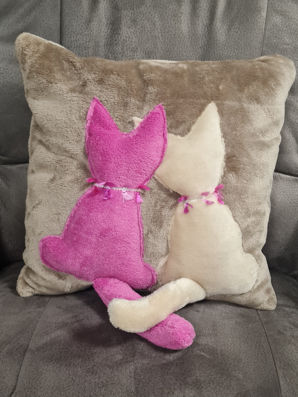 A semleges barna alapszínű díszpárnát két aranyos plüss cica díszíti, amelyek barátságos hangulatot és otthonosságot visznek bármelyik helyiségbe. A kézzel készített kivitelnek köszönhetően minden darab egyedi, ezért a nappalid vagy hálószobád igazi éke lehet. A kellemes, visszafogott árnyalatok miatt könnyű más textilekkel kombinálni, és hosszú távon is időtálló választás.