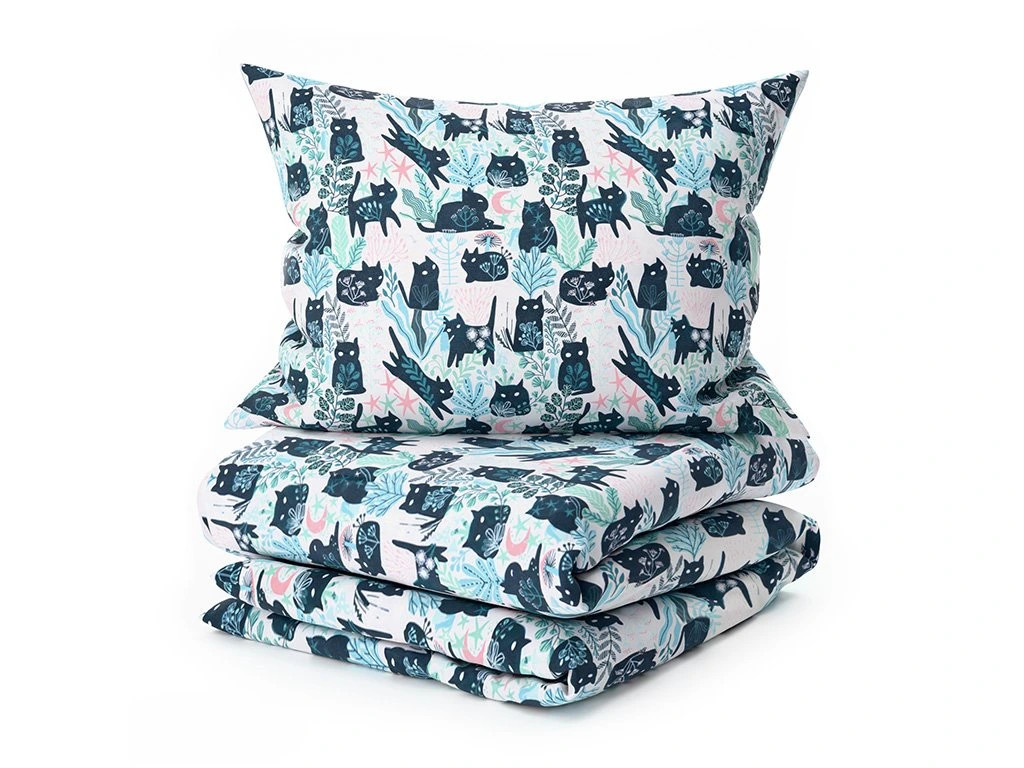 A mintázat különlegessége, hogy a fekete cicák részletes, aprólékos grafikával jelennek meg, így a huzat játékos, de mégis harmonikus látványt nyújt. A mosás után is gyönyörű marad, nem fakul ki, és megőrzi eredeti struktúráját, így hosszú távon is élményt ad. A cicás takaró és a párnahuzat együtt igazán harmonikus szettet alkot, amely bármely hálószobát feldob.